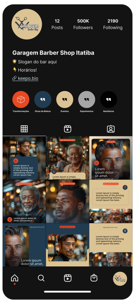 O Instagram do Garagem Barber Shop traduz fielmente a identidade da marca, unindo estilo, tradição e personalidade em cada publicação. A estética visual é marcada pelo uso de cores sólidas da paleta da marca, contrastes elegantes e tipografias modernas que garantem legibilidade e impacto. As fotos reforçam o vínculo humano e o protagonismo do cliente, sempre em destaque com expressões autênticas e ambientações calorosas. O feed é pensado para transmitir confiança, experiência e cuidado, refletindo a proposta do Garagem: mais do que cortes, uma barbearia que valoriza histórias, estilo e conexões reais com seu público.