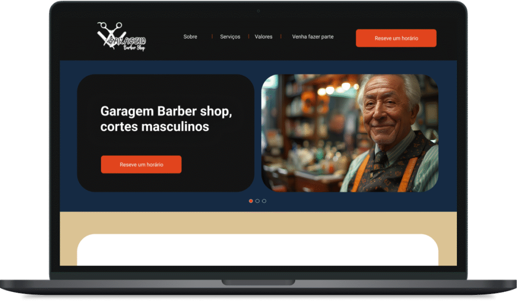 O site do Garagem Barber Shop traduz com clareza a identidade vibrante e confiante da marca. Com um visual impactante, a combinação entre o preto e o vermelho alaranjado cria contraste, chama a atenção e transmite energia logo na primeira dobra. A tipografia em destaque e os botões de chamada para ação, como o “Fale conosco”, direcionam o usuário com objetividade e facilidade. A imagem de fundo reforça o propósito do negócio — cuidado e transformação — enquanto o layout direto e moderno reforça a proposta da barbearia: um espaço onde estilo, experiência e atitude caminham juntos.