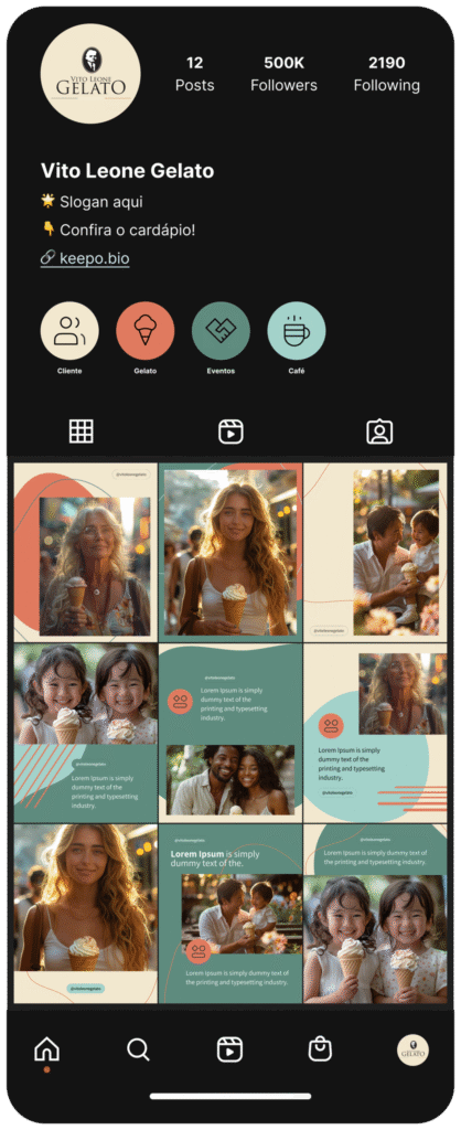 O Instagram da Vito Leone Gelato transmite uma identidade visual elegante, afetiva e acolhedora. As cores suaves, combinadas com elementos gráficos retrô e imagens reais, criam uma atmosfera que remete à tradição italiana e ao prazer de momentos simples. A presença de pessoas em situações espontâneas, saboreando gelato, reforça a proposta emocional da marca, aproximando o público de uma experiência genuína e calorosa. O feed é harmonioso, visualmente atrativo e convida o usuário a sentir o sabor e o estilo de vida que a marca representa