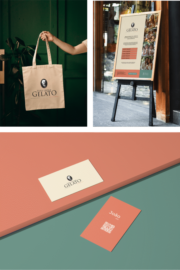 As artes gráficas do Vito Leone Gelato foram desenvolvidas para traduzir visualmente a sofisticação e o charme clássico da marca. Aplicadas em materiais como sacolas, cartões e placas, elas reforçam a identidade visual com o uso consistente da paleta de cores e da tipografia elegante. Cada peça comunica tradição, cuidado e autenticidade, mantendo uma linguagem coesa que fortalece o reconhecimento da marca em todos os pontos de contato com o cliente.